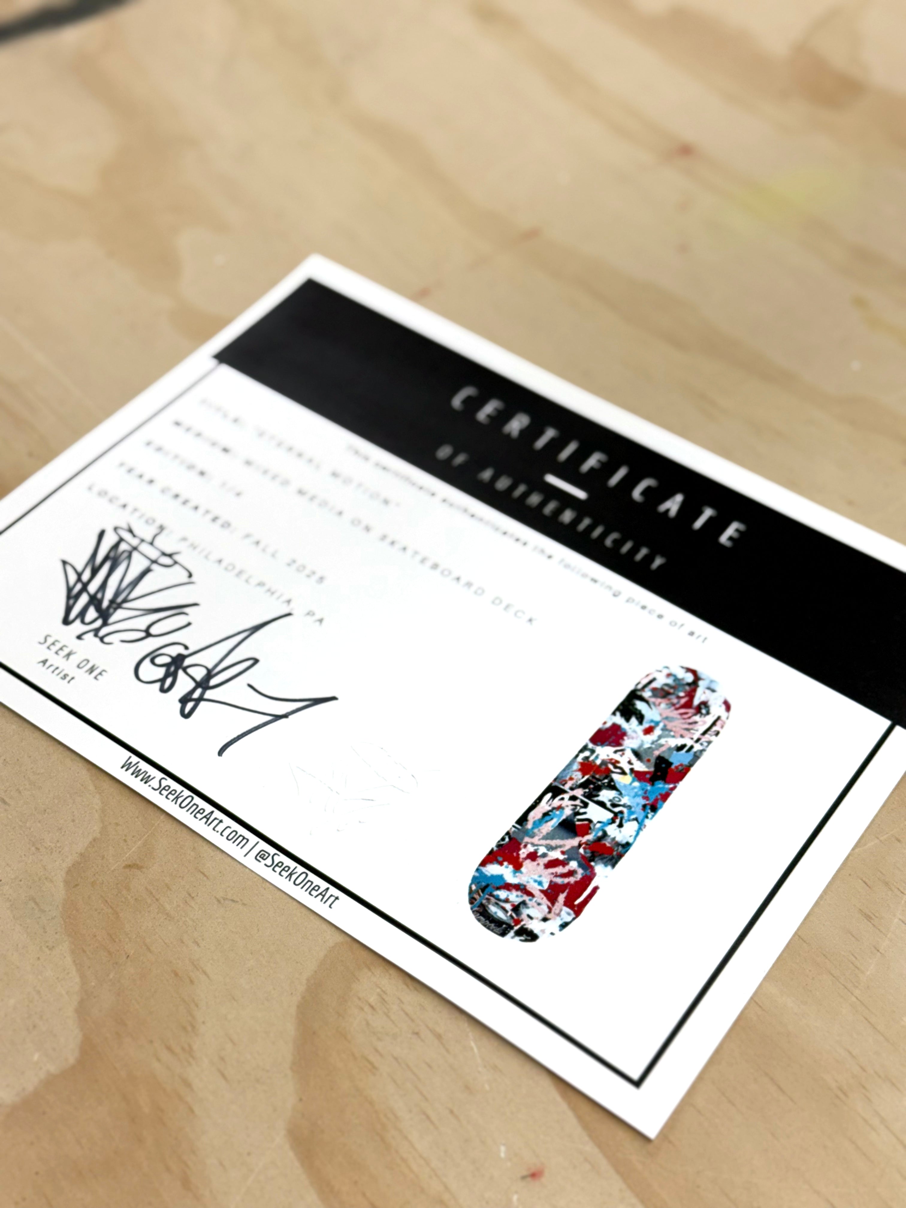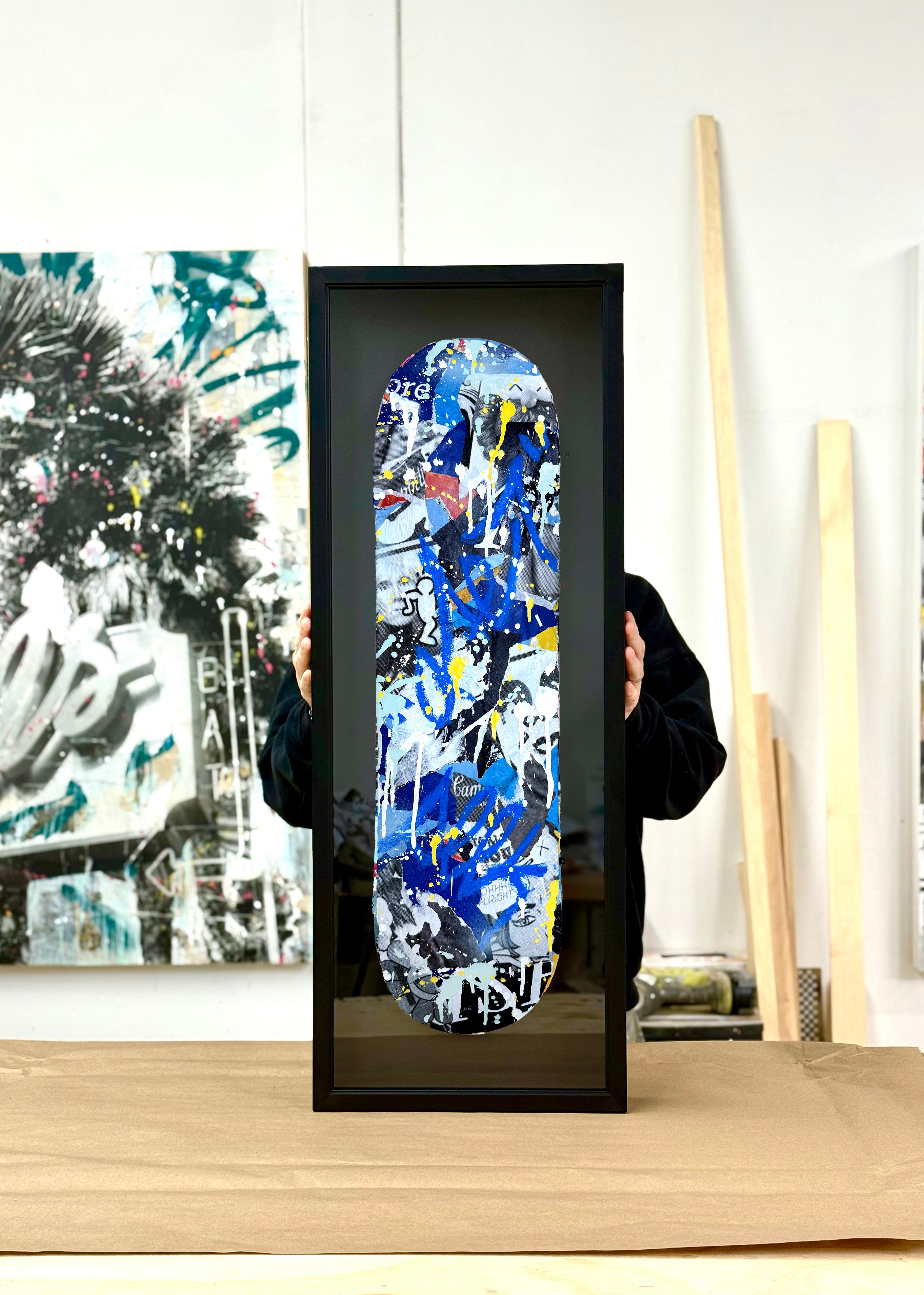 Every deck is individually hand-finished, creating a distinct composition that captures the layered energy of street art Presented in a custom fitted black-on-black frame, each piece is signed and numbered on the back, certifying its authenticity within this exclusive edition of four.
